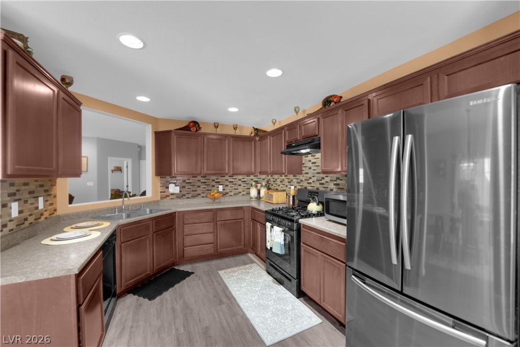 3-bedroom townhome with a 2-car garage and a good-sized backyard?rare at this price point! Fresh exterior paint on the trim, doors, and garage door adds curb appeal. Functional floor plan features a bedroom and bathroom with shower downstairs, ideal for guests or flexible living. Upstairs offers two spacious bedrooms, both with their own private bathrooms. Bright and open layout with a kitchen that offers ample storage and overlooks the living area while still feeling separate. Flooring updates needed?priced accordingly and a great opportunity to make it your own. All appliances are included. Located in a gated North Las Vegas community with parks and convenient access to shopping, dining, and freeways.
